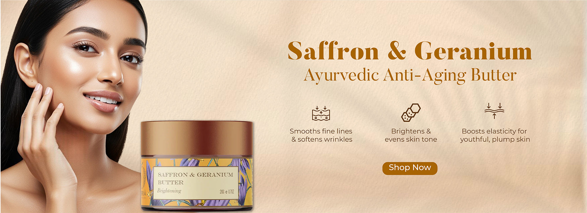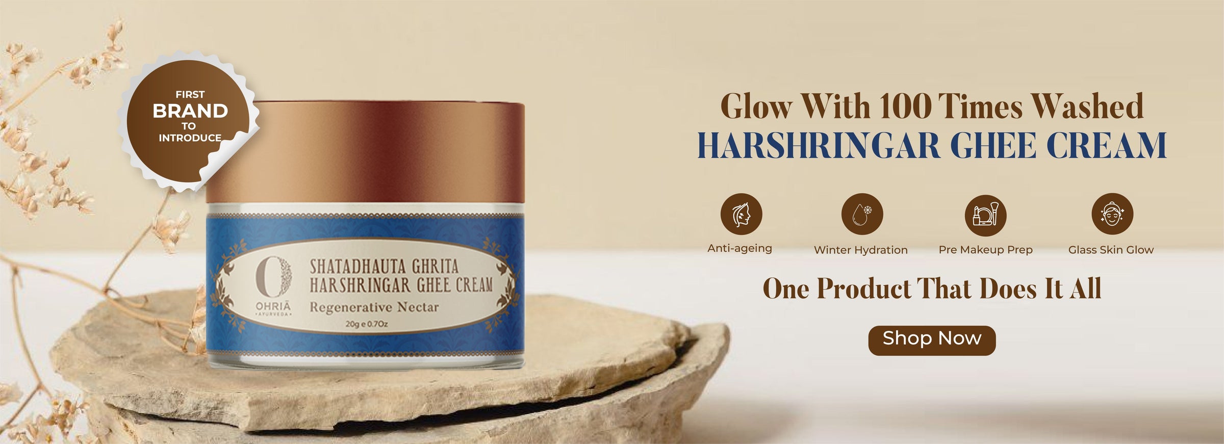 Ghee cream: Harshringar Ghee Cream, infused with Shatadhauta Ghrita and moonlit Harshringar flowers, deeply hydrates and firms skin while soothing irritation for a glowing, revitalized complexion.
