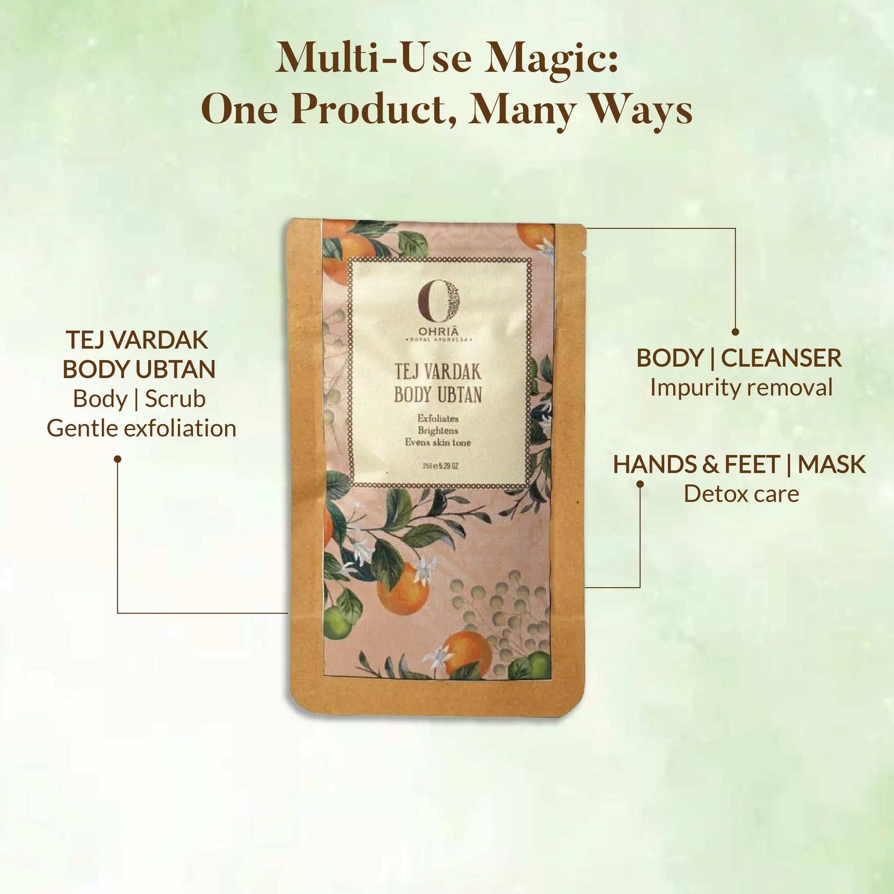 This 100% natural ubtan is suitable for all skin types and is designed to exfoliate and remove dead skin cells while brightening and evening out your skin tone. Enriched with hand-pounded ingredients like almond, sandalwood, barley flour, and black mustard seeds, it gently nourishes the skin. Neem leaves purify and provide antibacterial benefits, while orange peel, rich in Vitamin C, supports collagen and elastin production. Masoor and moong chilka dal naturally exfoliate, tighten pores, and cleanse while removing tan. Additionally, sariva and yashtimadhu work to brighten the skin and reduce pigmentation, making this ubtan a potent blend for healthy, breathable skin that enhances absorption.