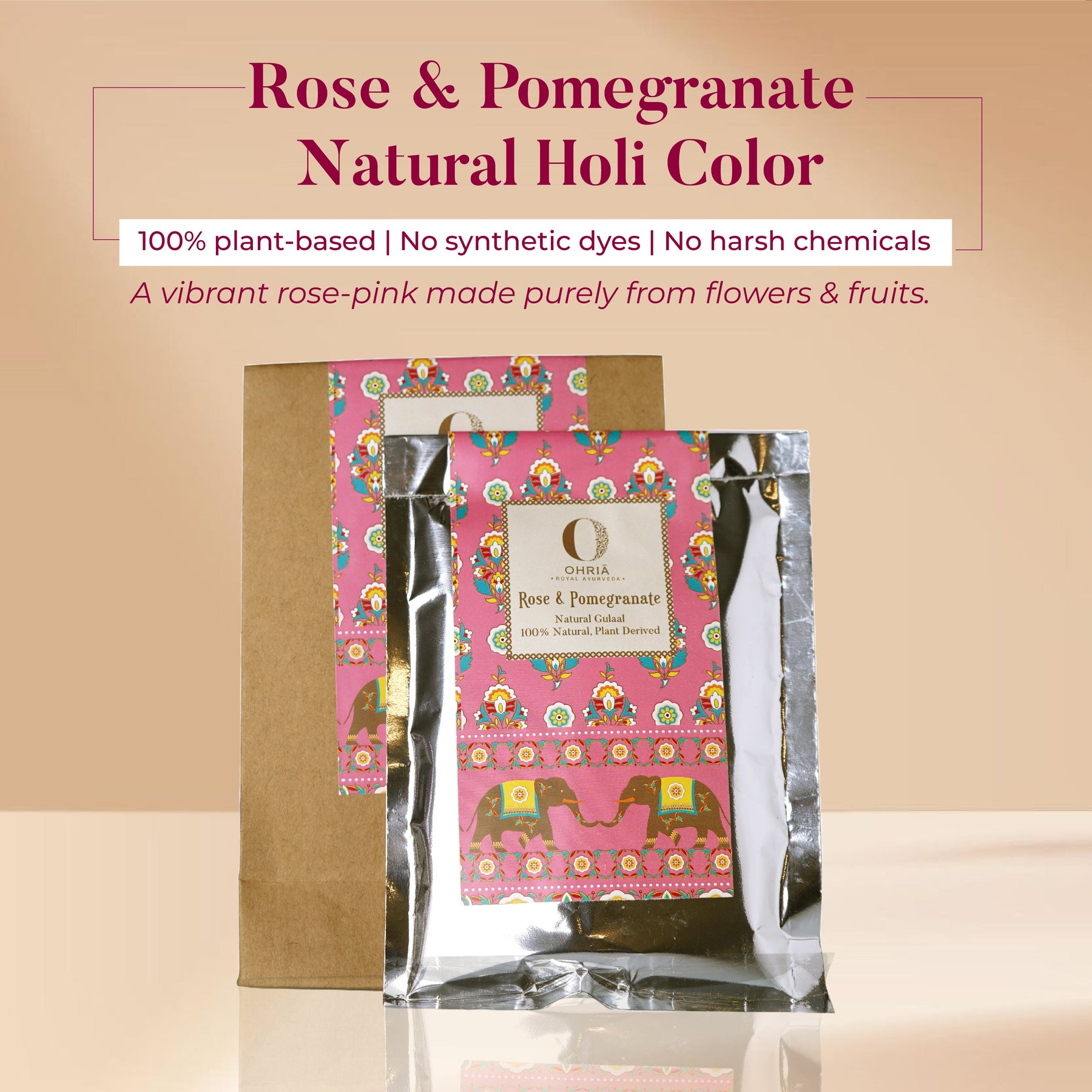 Our Rose & Pomegranate Natural Holi Color is crafted from 100% plant-based ingredients, no synthetic dyes, no harsh chemicals, no hidden irritants. Just the pure vibrancy of nature.