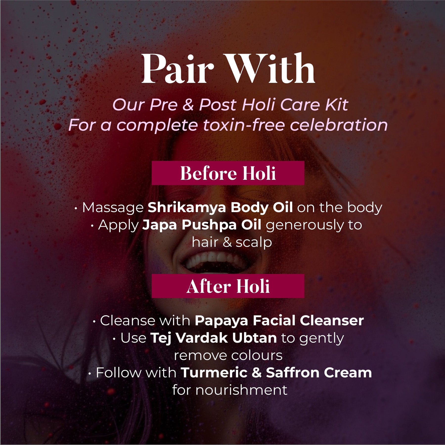 Unlike commercial Holi colors that can cause dryness, rashes, and long-term skin damage, this blend is made using dried rose petals, beetroot powder, and pomegranate peels — ingredients traditionally known for their skin-loving properties.