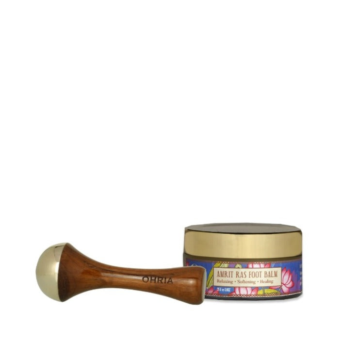 Experience deep relaxation with this Ayurvedic duo. The Kansa Foot Wand stimulates marma points, boosts circulation, and eases stress, while the Amrit Ras Foot Balm heals, softens, and cools tired feet. Together, they detoxify, rejuvenate, and restore balance to body, mind, and spirit.