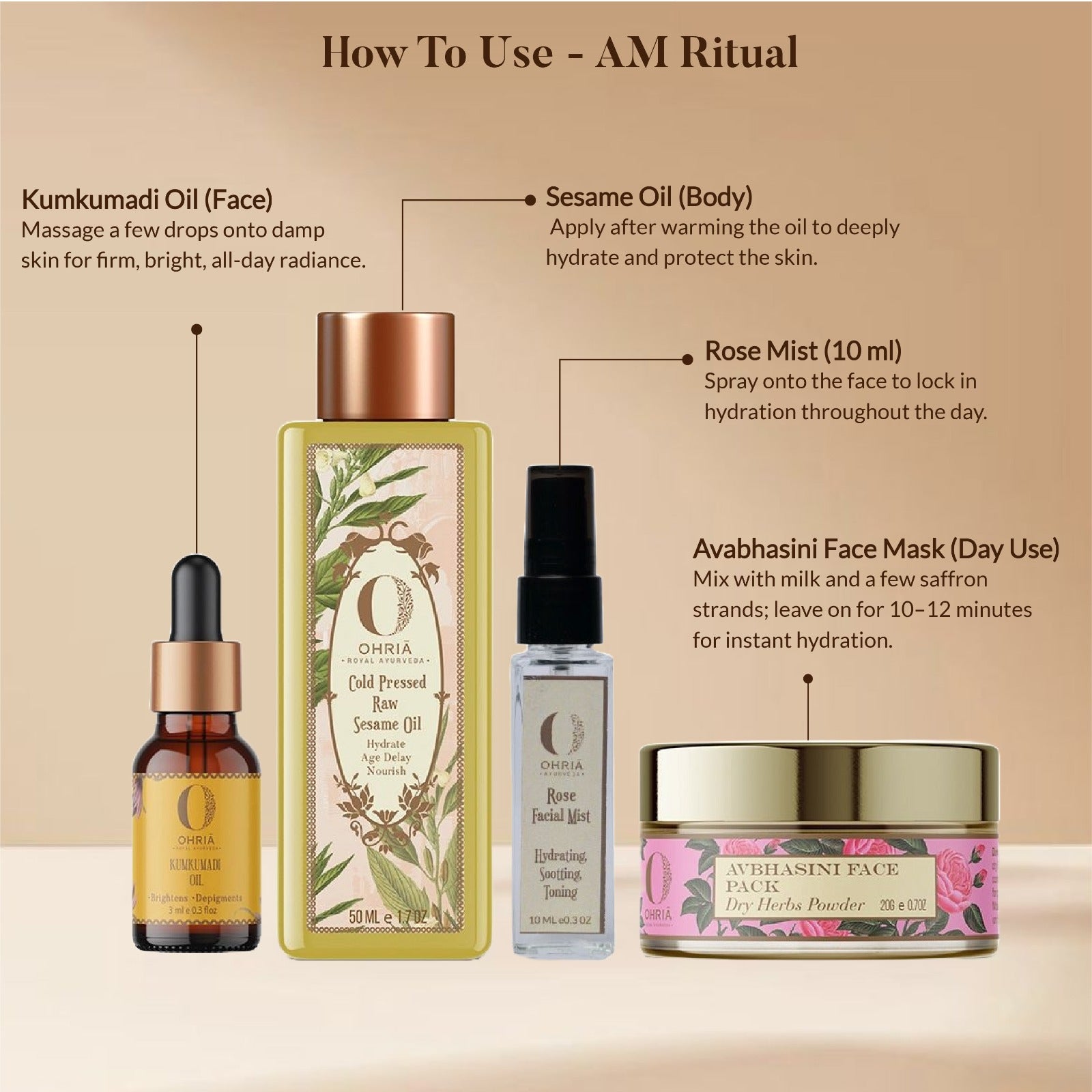 From the energising morning buccal massage paired with saffron-rich Kumkumadi Oil to the warming Avabhasini Mask during the day and the antioxidant-loaded Turmeric Butter at night, this ritual ensures your skin stays bright, even-toned, plump, and resilient all winter long.