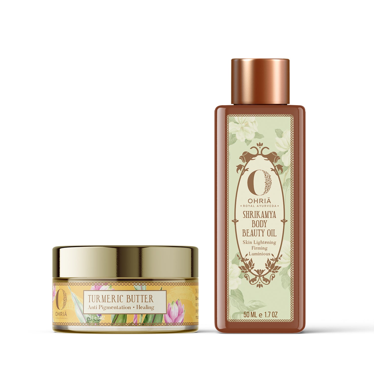 Discover the ultimate natural solution for treating stretch marks with the powerful combo of Shrikamya Body Oil and Turmeric Butter.