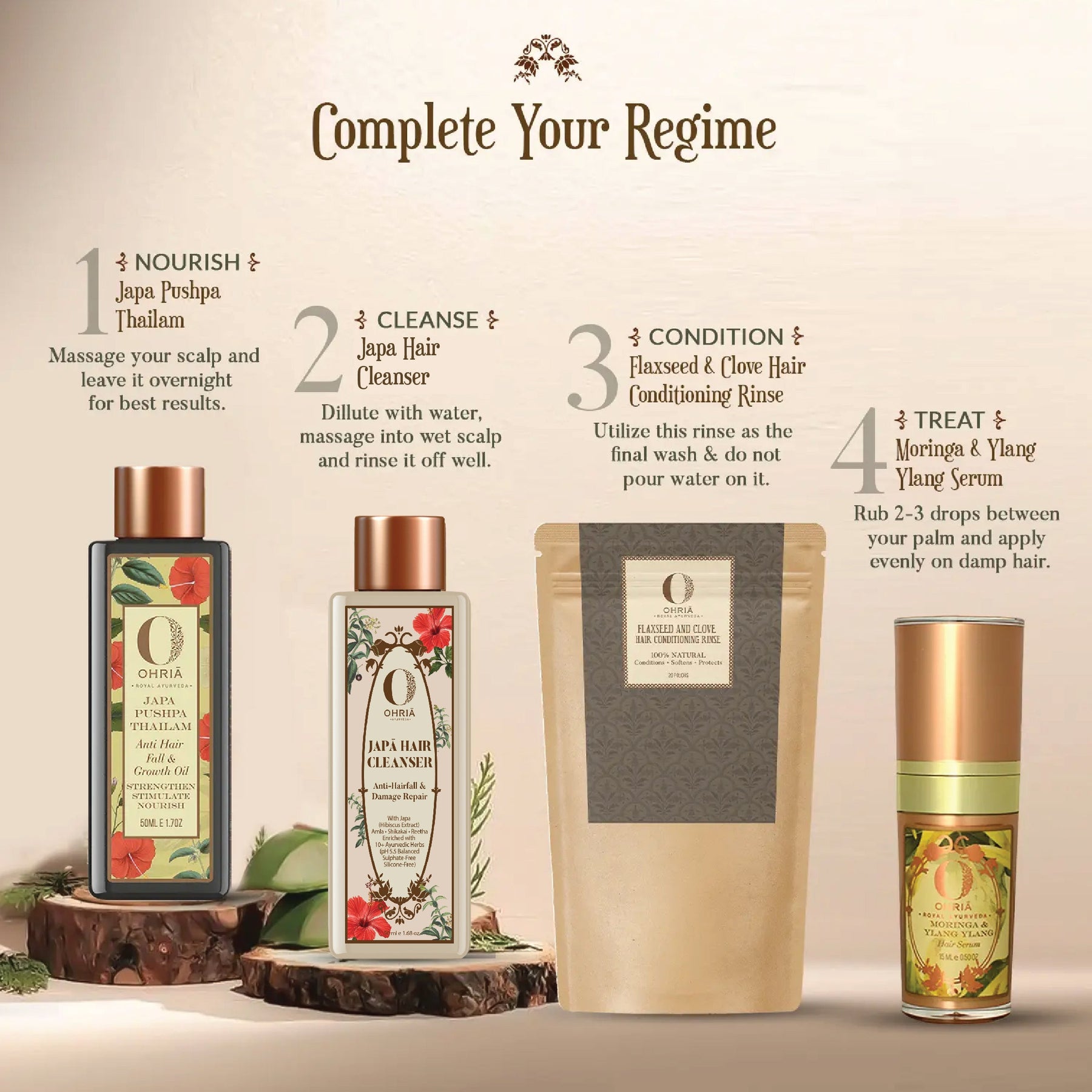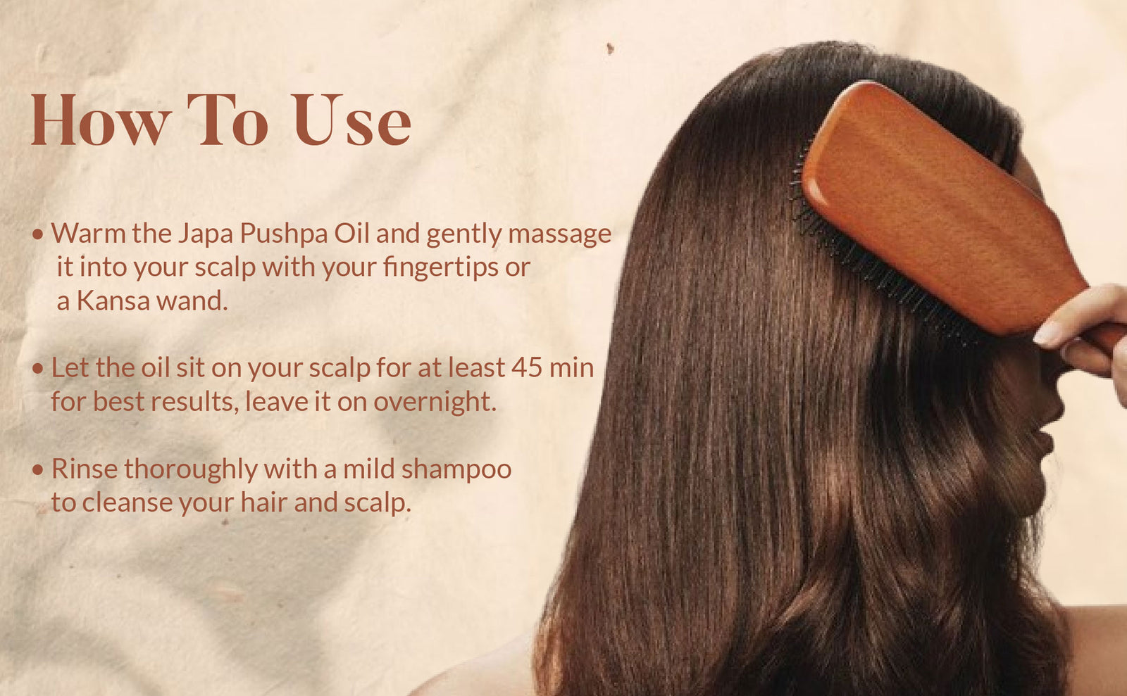 • Warm the Japa Pushpa Oil to a comfortable temperature and gently massage it into your scalp with your fingertips or a Kansa wand.