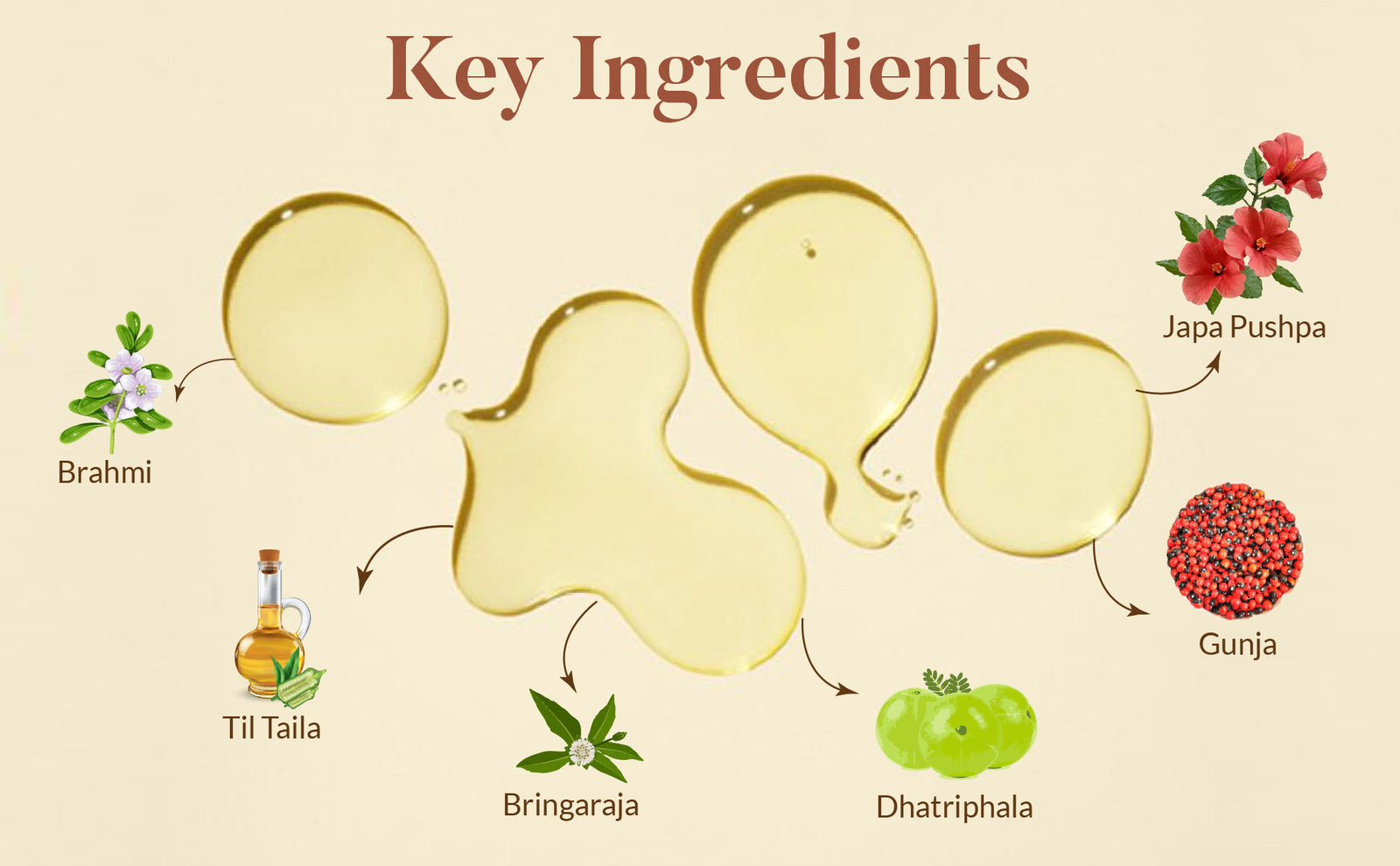 Til Taila (Sesamum indicum-10%), Neeli (Indigofera tinctoria-10%), Bringaraja (Eclipta prostrata-10%), Sathakrathulatha (Cardiospermum halicacabum-10%), Dhatriphala (Phyllanthus emblica- 10%), Madhuka (Glycyrrhiza glabra-1%), Gunja (Abrus precatoriu-1%), Ajaksheera (Goat Milk-10%), Mahisheeksheera (Buffalo Milk-10%), Goksira (Cow Milk-10%), Keraksheera (Coconut Milk-10%), Anjana (Berberis aristata- 1%), Japa Pushpa (Hibiscus rosa-sinensis- 7%)