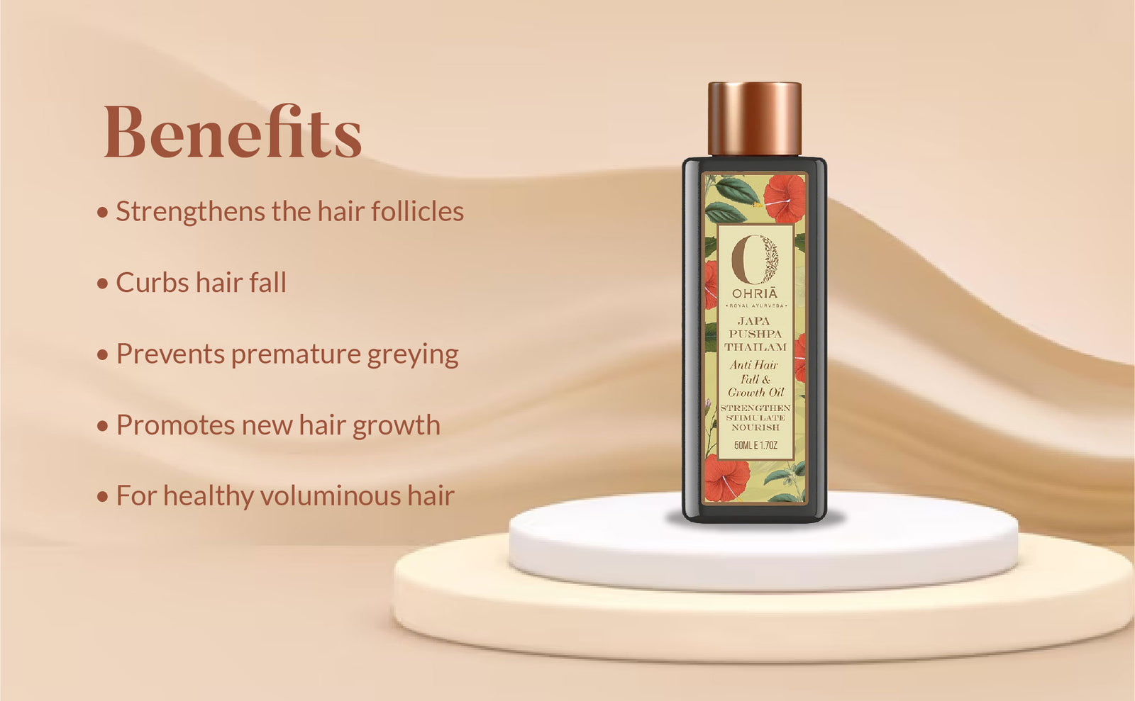 Japa Pushpa Oil is designed to combat- premature greying and stimulate new hair growth.
